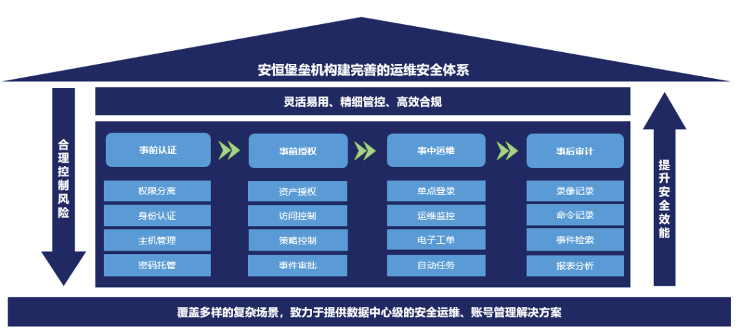 安恒信息堡垒机产品基于多样的复杂场景,基于多年对政府、企业、教育、医疗、军工等行业的经验积累,构建了从事前认证,到事前授权,再到事中运维,最后到事后审计的完善运维安全体系,能够有效控制运维风险,提升内部管理安全效能。