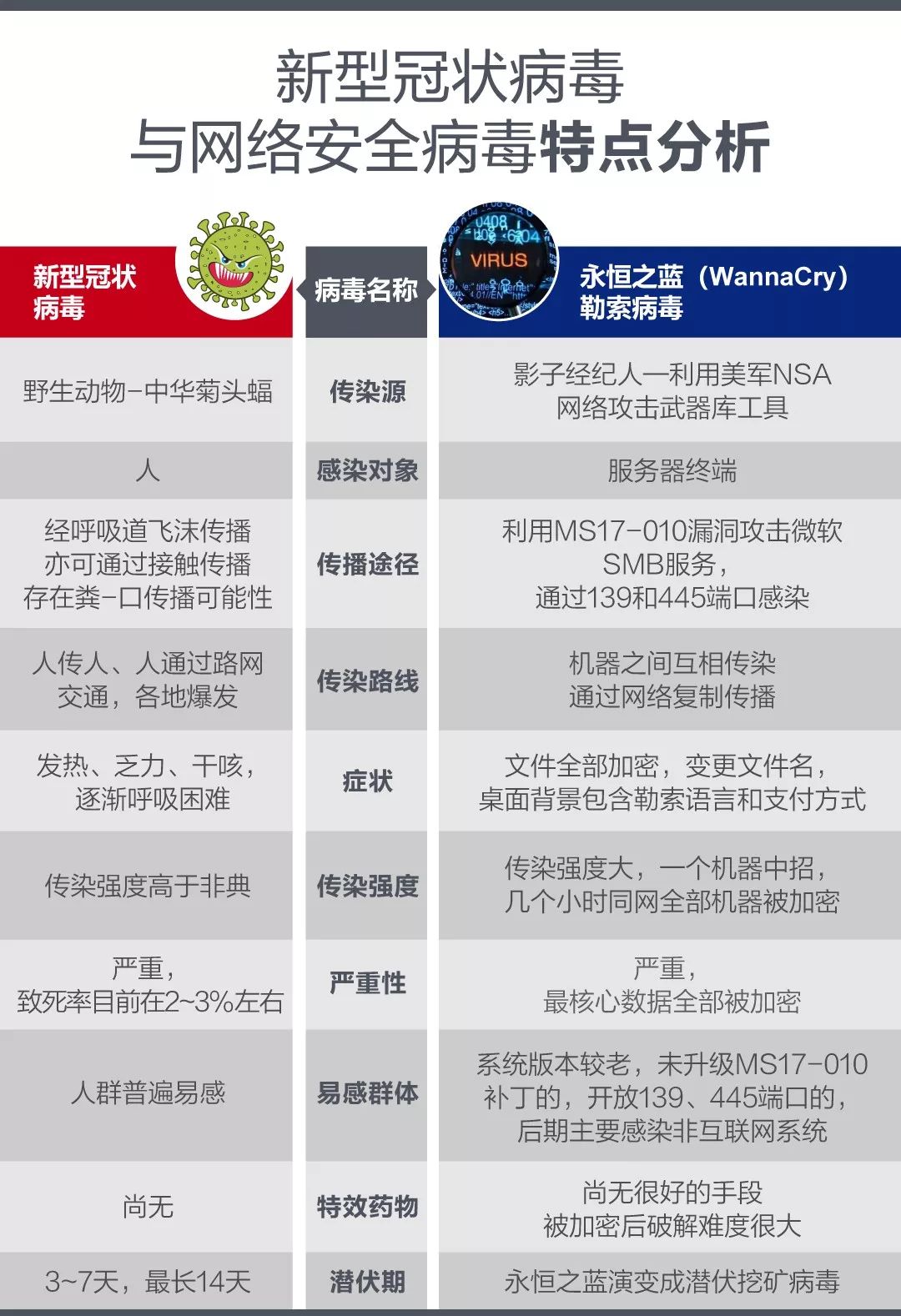近来,新型冠状病毒疫情从武汉蔓延至全国,波及全球多个国家。关于新型冠状病毒的致病机理、传播途径、爆发背景等不断被分析和还原,防控措施也随之不断升级。站在大视角下看,新冠病毒与网络安全攻击尤其是勒索病毒相似或者相近,新冠病毒的检测、预防、控制、隔离、治疗方式和手段与网络安全防治思路也大体趋同,研究它们的异同点和规律性,无疑有积极的借鉴意义和启发作用。